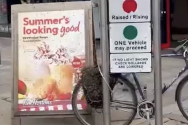 Shoppers in Manchester city centre were left stunned when a huge swarm of bees descended on a parked bike on Market Street.