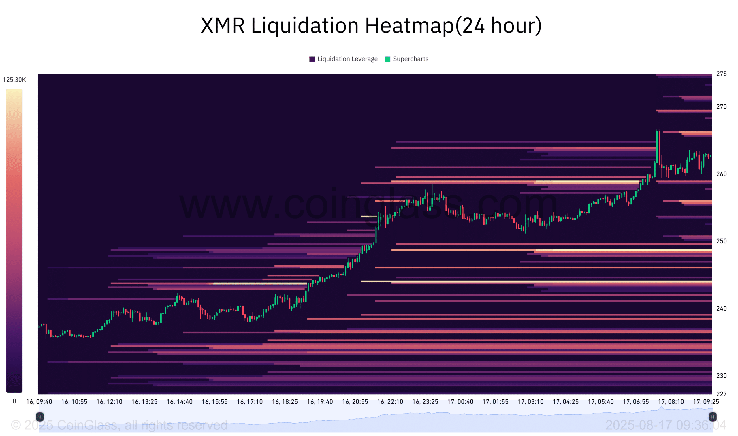 The liquidation heatmap was concentrated with long leverage orders as per CoinGlass data. The largest concentration was between $250 and $234 where more $1 million XMR were longed.