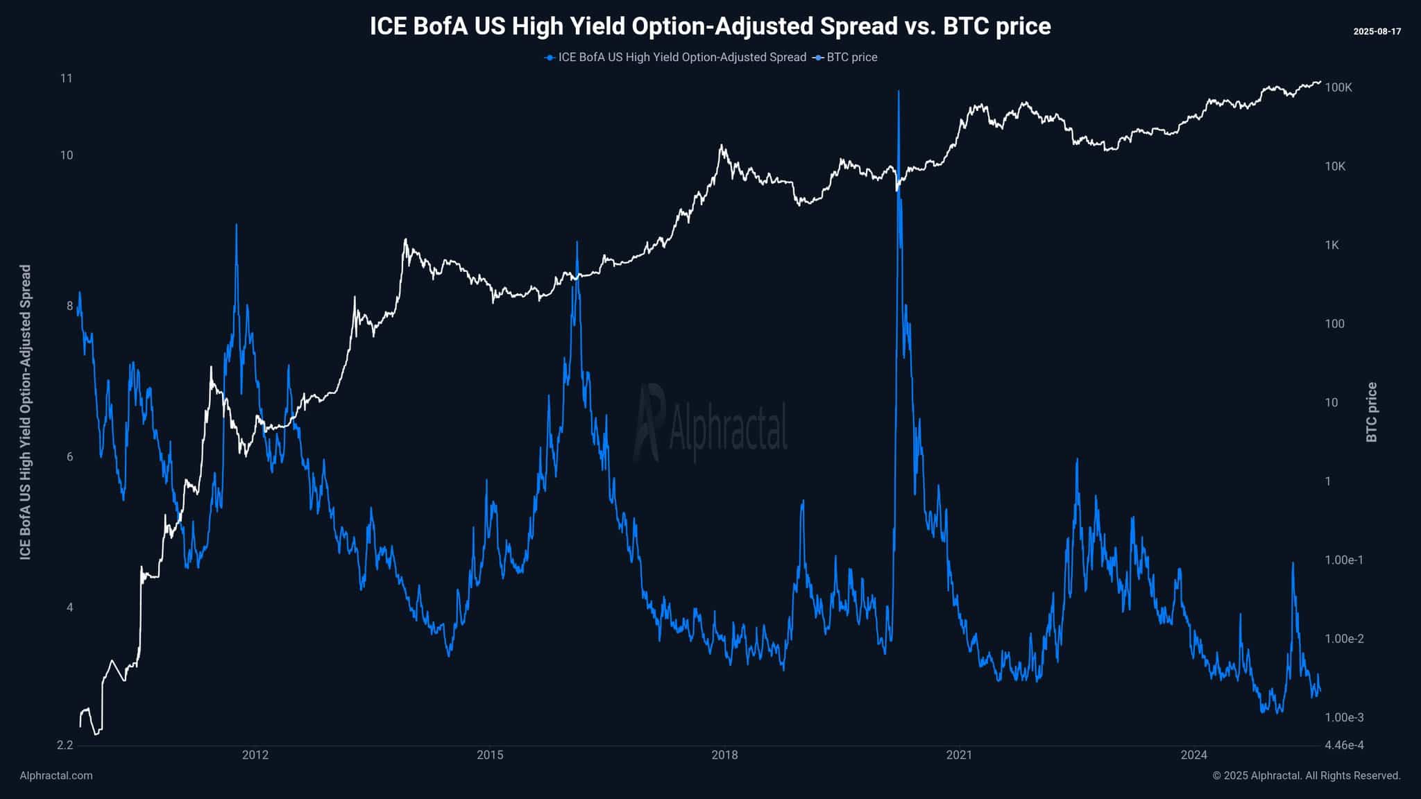 According to ICE BofA Option-Adjusted Spreads (OASs)—a macroeconomic metric that tracks investor risk appetite in the U.S.—Bitcoin’s potential movements can often be predicted.