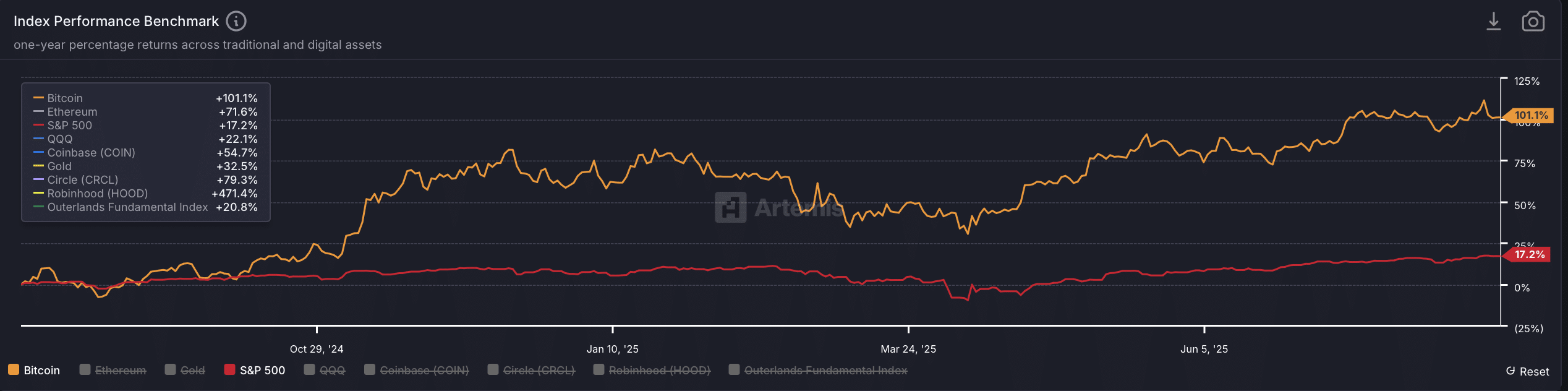 A comparison of Bitcoin against major stock indexes showed that it continued to outperform the S&P 500. According to Artemis, Bitcoin delivered a 101% gain in the past year, compared to the S&P 500’s 17.2%.