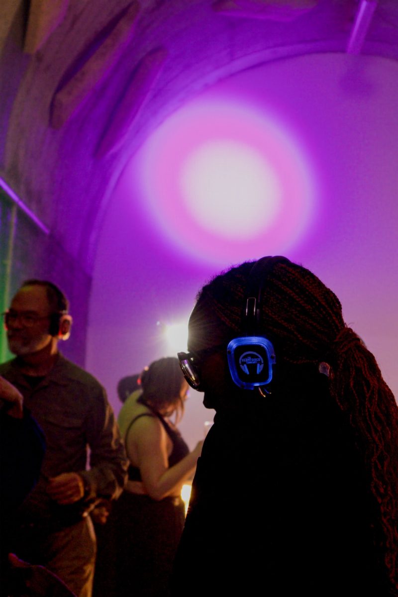 A key subject in Boyce’s recent work, the silent disco is not a party, but rather a framework for close listening, improvisation and collective performance. This sense of openness and play continues in the exhibition space itself. Boyce has taken still images from ‘Silent Disco’ and arranged them into repeating, kaleidoscopic patterns to create wallpaper installations within the gallery, blurring distinctions between the artwork and its means of production and display. Boyce’s installation immerses us in subtle cues from the original performance—the lights,the uncanny silence, the dancers’ whirling bodies—suggesting that at any moment, the disco could begin again.