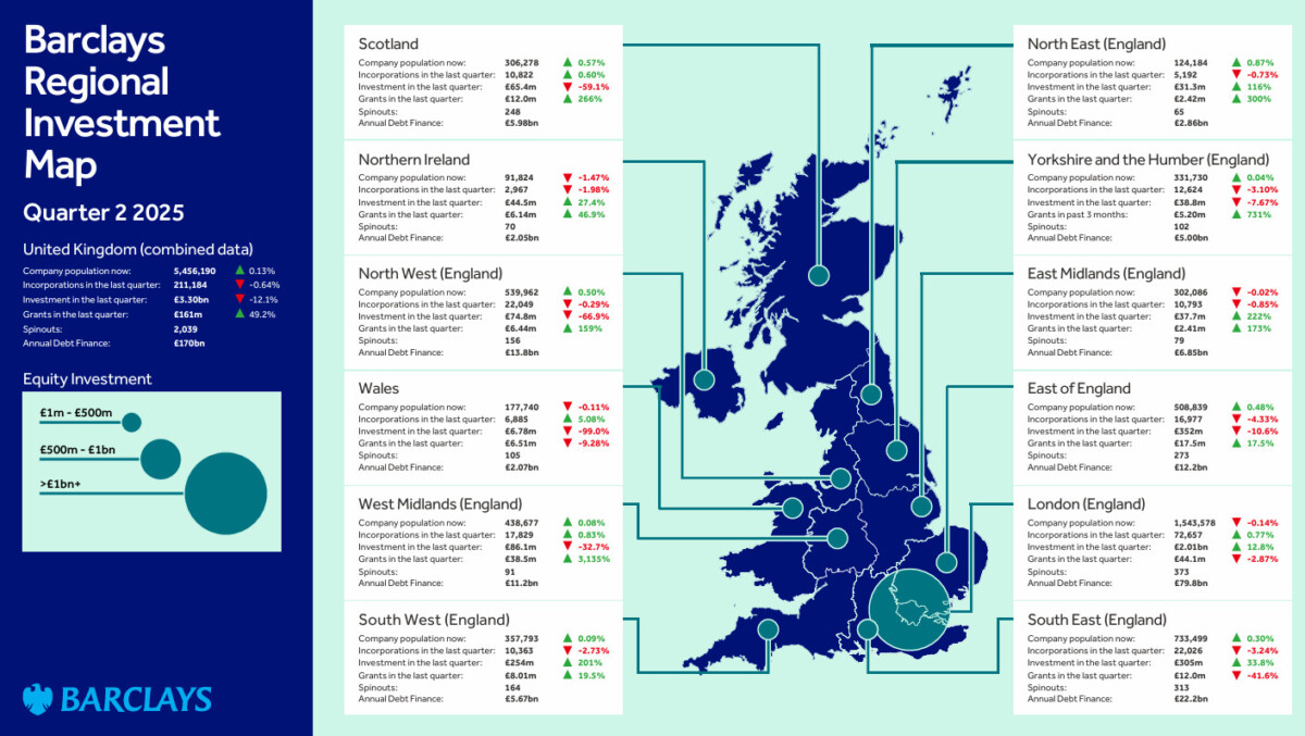The number of UK corporations has grown from 5.45m in Q1 to 5.46m in Q2, benefitting from rising equity investments and a strong performance among university spinouts, according to the Barclays Regional Investment Map, which provides insights into UK company funding and growth.