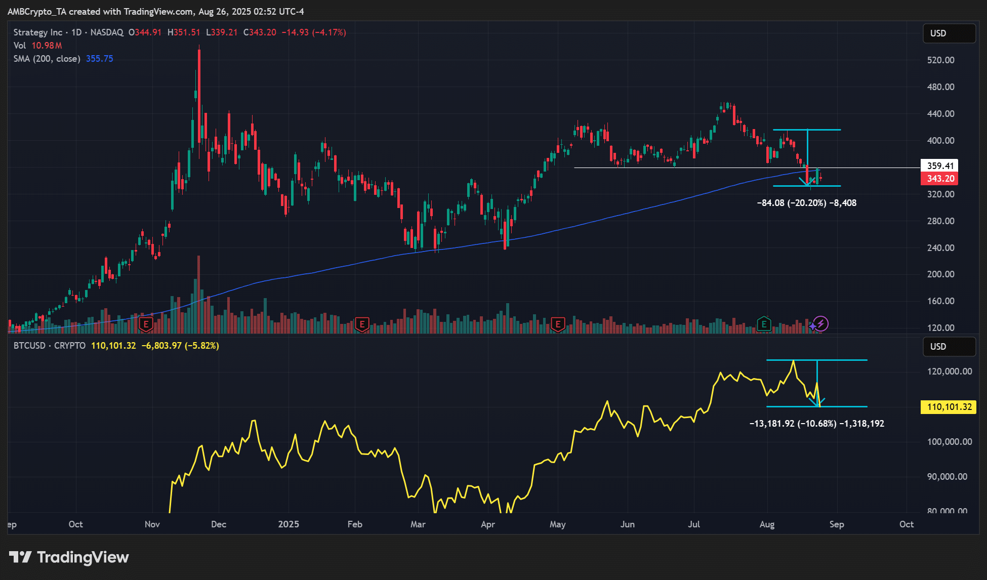 But the stock was below the 200-day Simple Moving Average (SMA), a key level it has defended throughout 2025. As such, an extra BTC pullback below $110K could put MSTR bulls in danger.