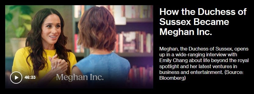 So what does Meghan, Duchess of Sussex do to promote With Love, Meghan? She takes part in a slick Bloomberg interview that airs the same morning as the newest eight episodes of her lifestyle series air on Netflix. And she’s not really talking about the series. No, instead, she talks about her family, fashions, and future. It’s no surprise that most of the stories are focusing on the news in that interview, rather than the packaged artificiality of the series (more on that later).