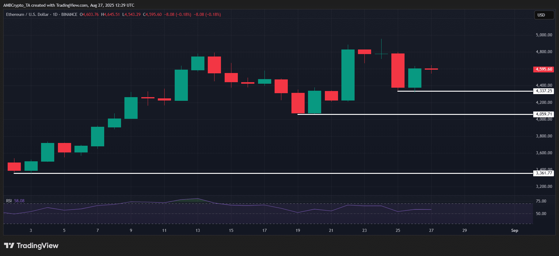 On 25 August, the altcoin dipped by 8.8% to $4,300, but a quick 5% reclaim showed the market’s buyers defending themselves. The bullish ETH/BTC ratio appeared to back the move, setting up a solid base here for the next leg up.