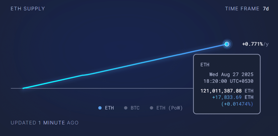 Over the past week, ETH has seen $900 million net inflows via Spot ETFs. This, at a price of $4,780, works out to roughly 188k ETH bought. At the same time, fresh issuance added just 17.8k ETH.