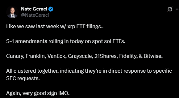 Canary/Marinade, Bitwise, Fidelity, Franklin, Grayscale, 21Shares and VanEck all made their submissions. ETF analyst Nate Geraci called the coordinated filings a “very good sign” for the likely greenlight for the products.