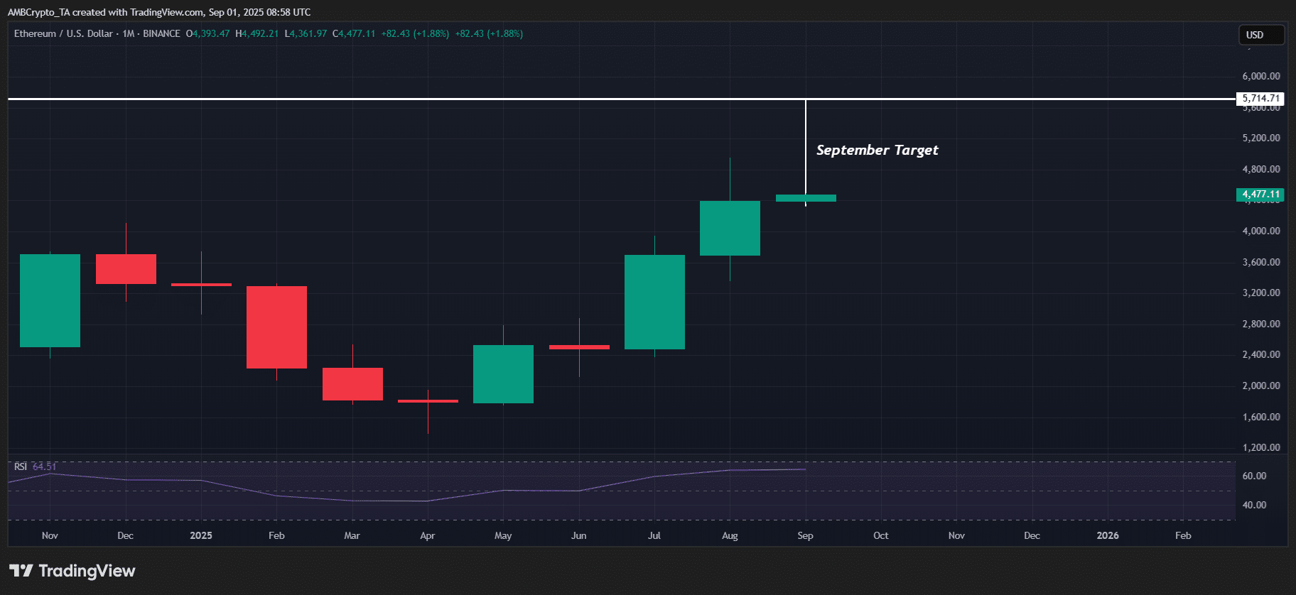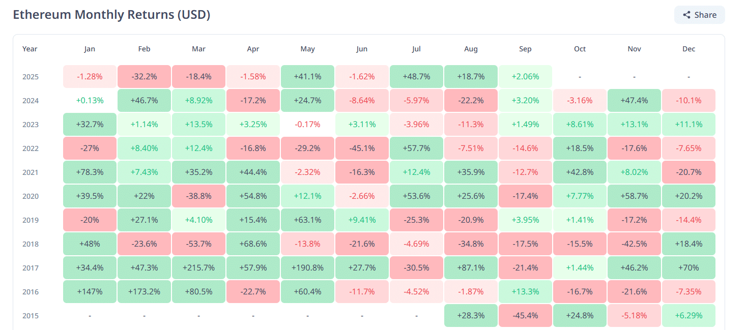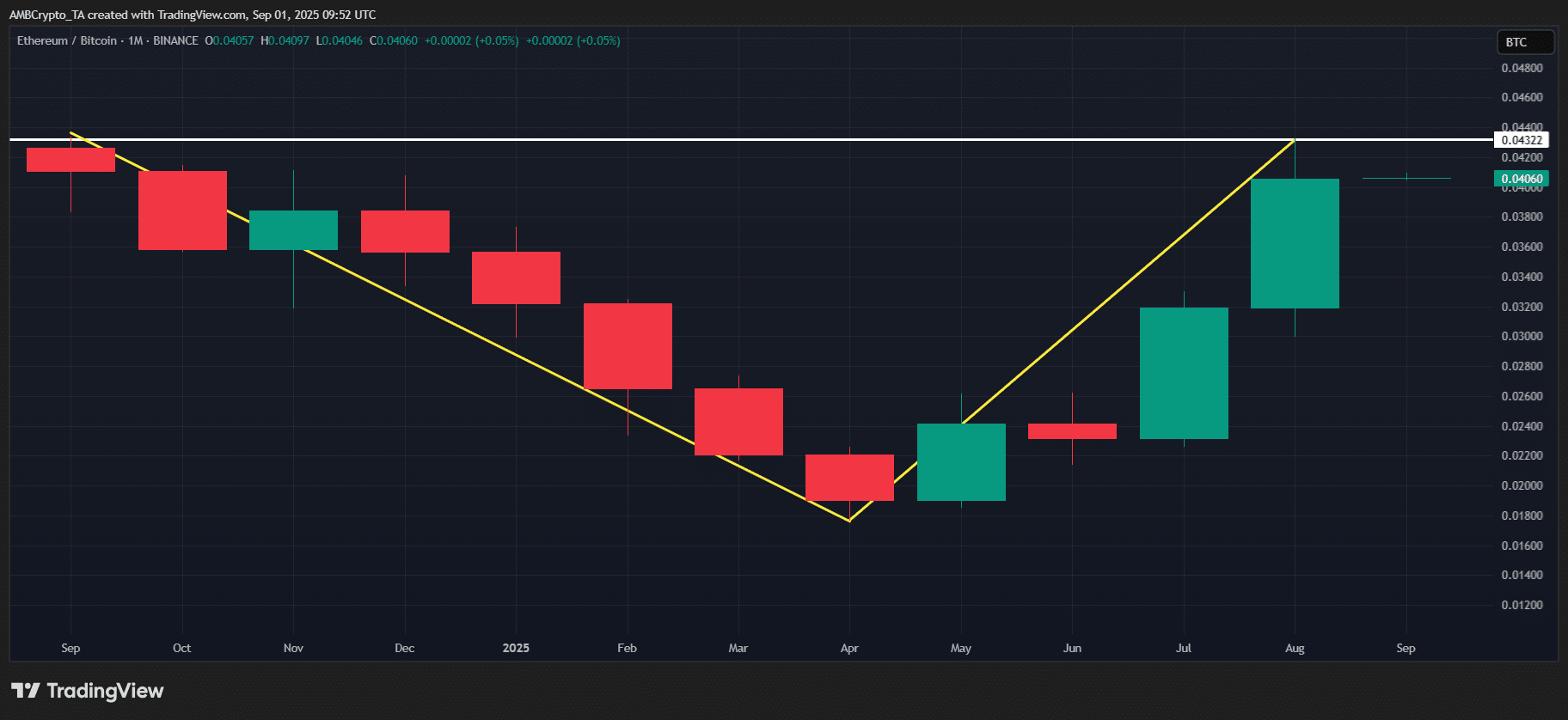 In fact, ETH surged +18.78% in August, nearly 3× Bitcoin’s losses. That chalked up Ethereum’s first real monthly divergence in years.