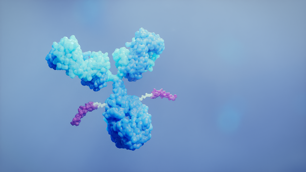 The Amgen team tested more than 150 different variations of antibody-peptide conjugate molecules before identifying the most promising candidate – an antibody linked to two peptides, which are small pieces of a protein. The antibody component of MariTide (in blue) inhibits GIPR and the two peptides (in purple) linked to the antibody activate the GLP-1 receptor.