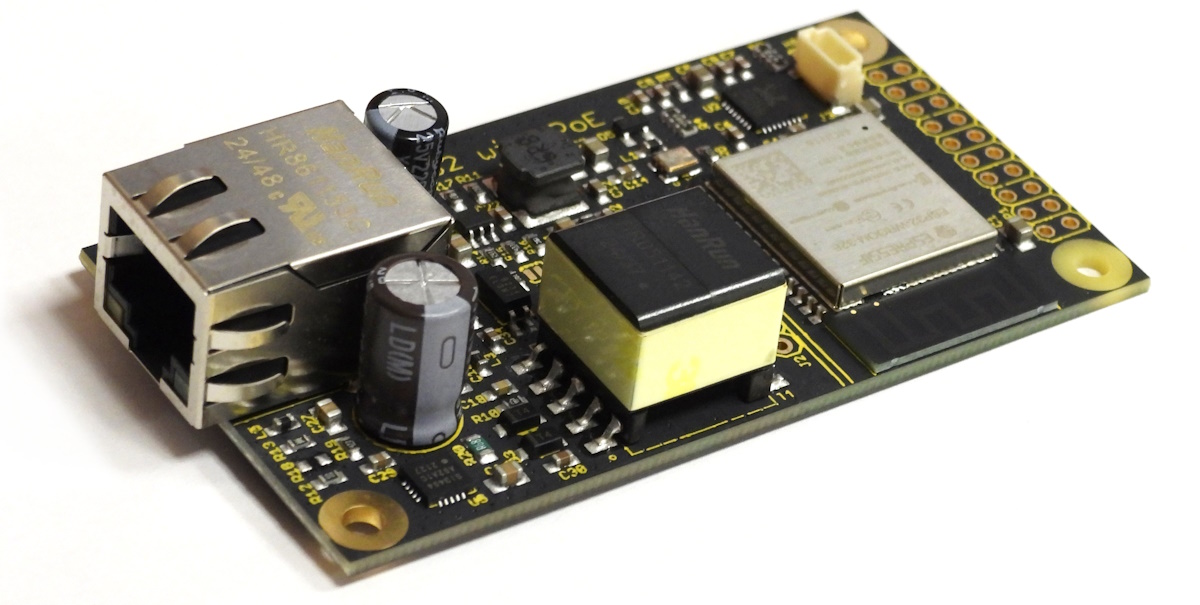 wESP32: The first fully isolated ESP32-based Ethernet board on the market with PoE up to 13W @ 12V. Optional wESP32-Prog programming module with micro-B USB released simultaneously. Later, the wEPS32-Prog-C was released with USB Type-C and Power Delivery, optionally delivering the same 13W @ 12V over USB PD if PoE is unavailable. Launched on Crowd Supply in 2018, still in production, and available through Mouser.