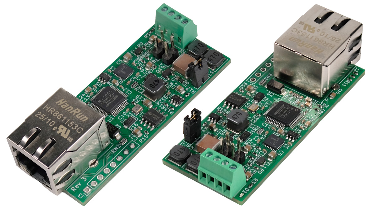 Observe the green screw block connector in the upper-right corner of the image. One pair of terminals is used to bring Ethernet in over a twisted-wire pair. The other pair is used to daisy-chain to the next board in the network.