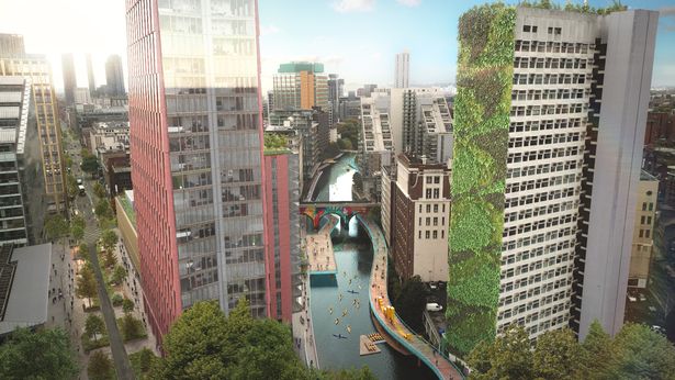 They could include constructing a 100-mile network of walkways along a city centre section of the River Irwell. Council images have showcased cyan-coloured wooden paths floating above both the Manchester and Salford sides of the river, complete with jetties for rowing boats and cycle lanes which snake around existing road bridges.