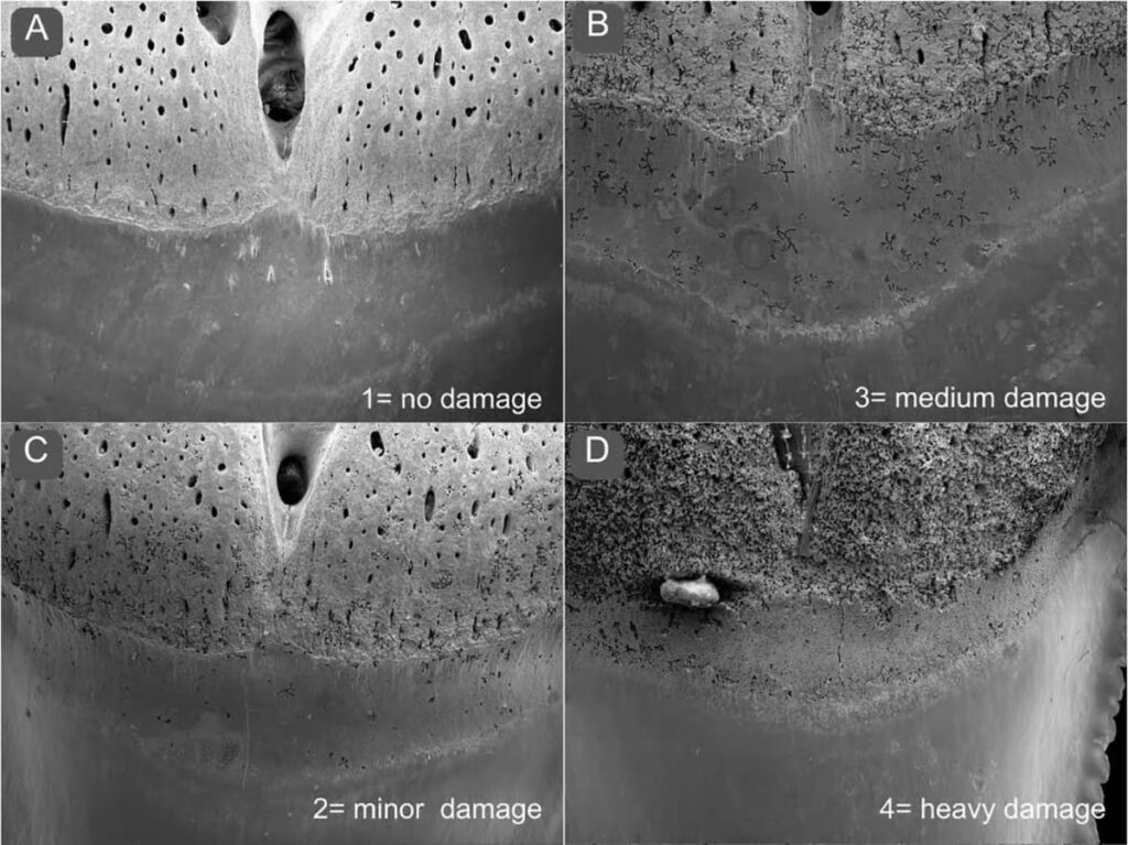 Assessment of tooth base damage. To assess the overall condition of the base, teeth were classified as (A) 1 = no damage, (B) 2 = minor damage, (C) 3 = moderate damage, (D) 4 = significant damage. © M. Baum et al. 2025