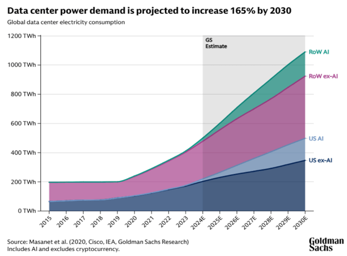 It doesn’t really matter which forecast we look at for data center electricity demand. They’re all sharply up and to the right. Below is a forecast from Goldman Sachs that presents a useful contrast between growth without AI and growth with AI. I believe the forecast is too conservative.