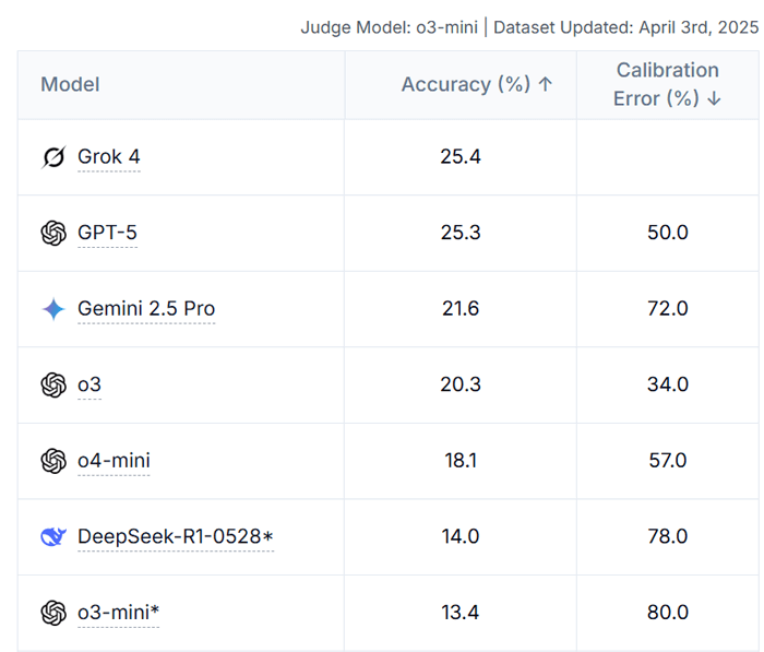 As for Humanity’s Last Exam, according to the leaderboard, xAI’s Grok 4 is on top but neck and neck with OpenAI’s GPT-5. The data, however, is not up to date, as it was last updated on April 3 this year.