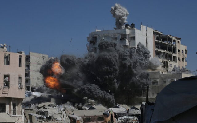 Smoke and flames rise after an Israeli military strike on a building in Gaza City, Sept. 12, 2025. (AP Photo/Yousef Al Zanoun)