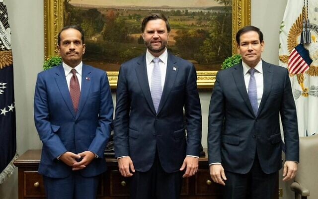 From L-R: Qatar’s Prime Minister Sheikh Mohammed bin Abdulrahman al-Thani, US Vice President JD Vance, and US Secretary of State Marco Rubio, meet in Washington, DC, September 13, 2025. (Qatar’s Foreign Ministry/X)