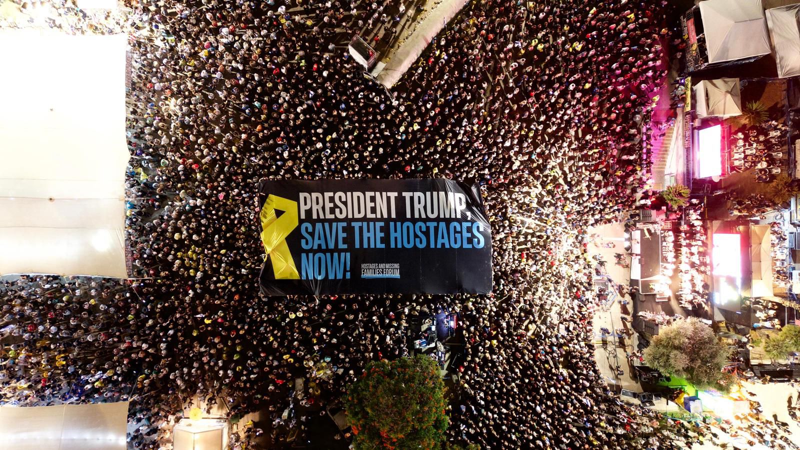 A massive banner calling for the US president to push a hostage deal in Gaza, unfurled at Hostage’s Square in Tel Aviv on September 6, 2025. (OM/Hostages Families Forum)