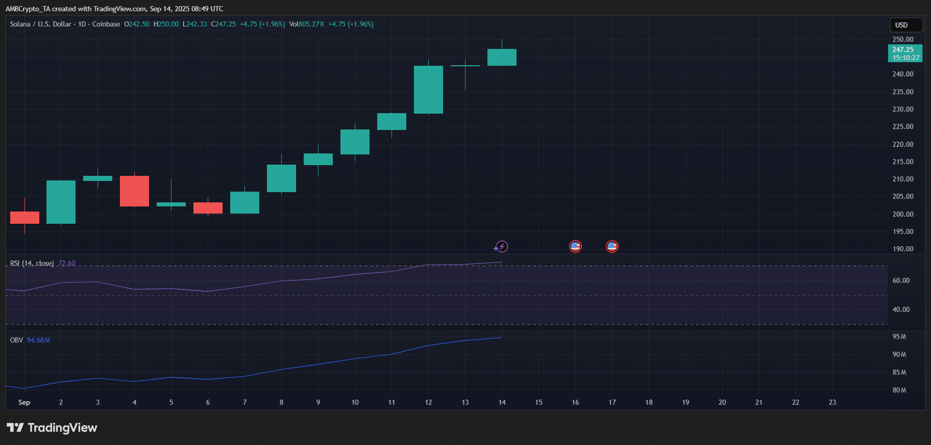 At press time, Solana traded at $247.25, holding close to the upper end of its recent rally.