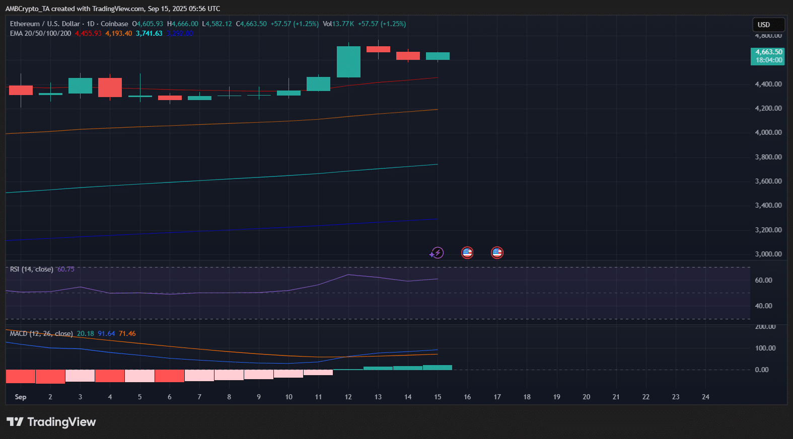 At press time, Ethereum traded at $4,663, holding steady above the $4,600 mark. The RSI showed moderate bullish momentum.