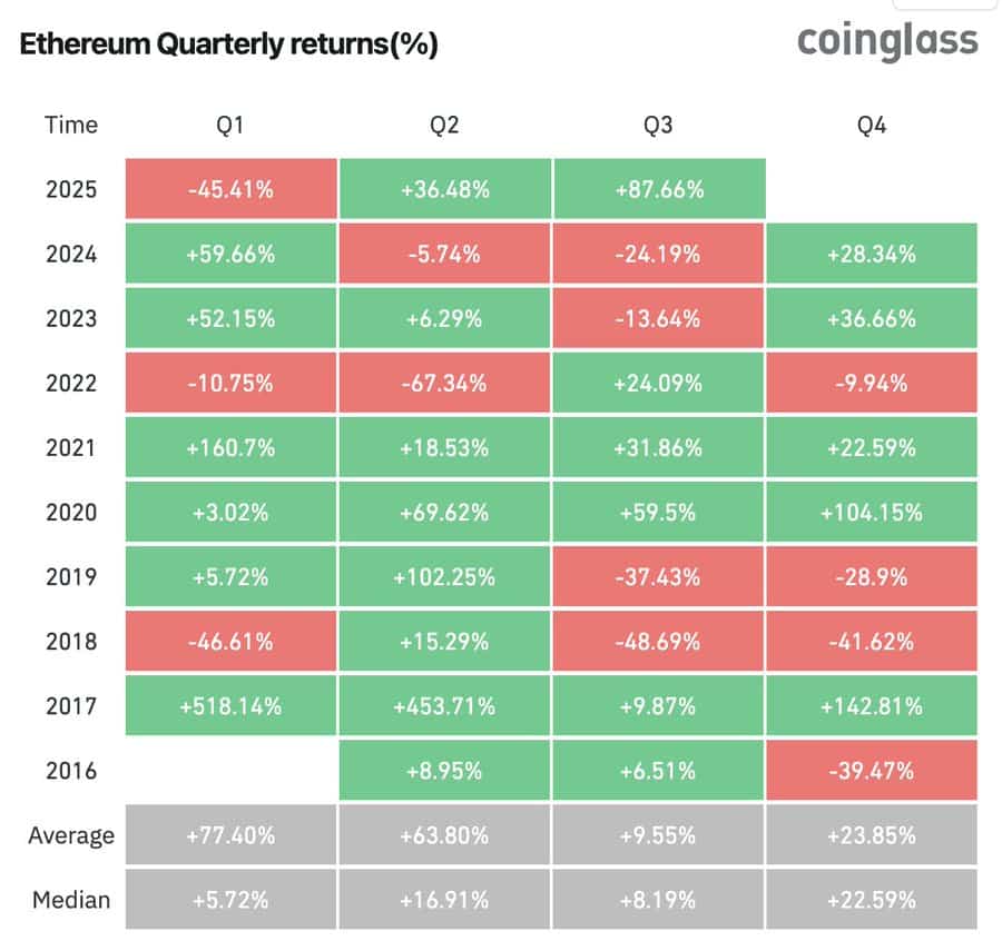 Historical data shows Q3 has been a mixed bag for ETH, with gains averaging just 9.55%. But 2025 is rewriting the script.