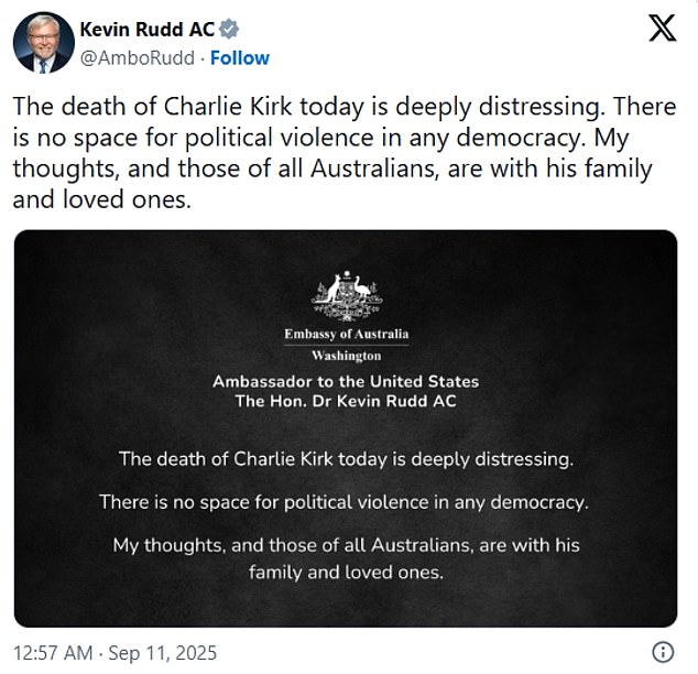 Remeikis also criticised the likes of Australia’s ambassador to the US, Kevin Rudd, for expressing grief at Kirk’s death, arguing such tributes overlooked his role in ‘demonising trans people’ and fostering a ‘harmful grift.’