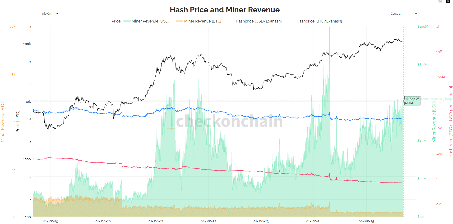 As the checkonchain data shows, the daily miner revenue was at $61 million on the 10th of September.