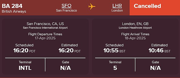 The BA 284 flight from San Francisco International Airport to London Heathrow due to depart at 4.20pm on April 17 was cancelled.