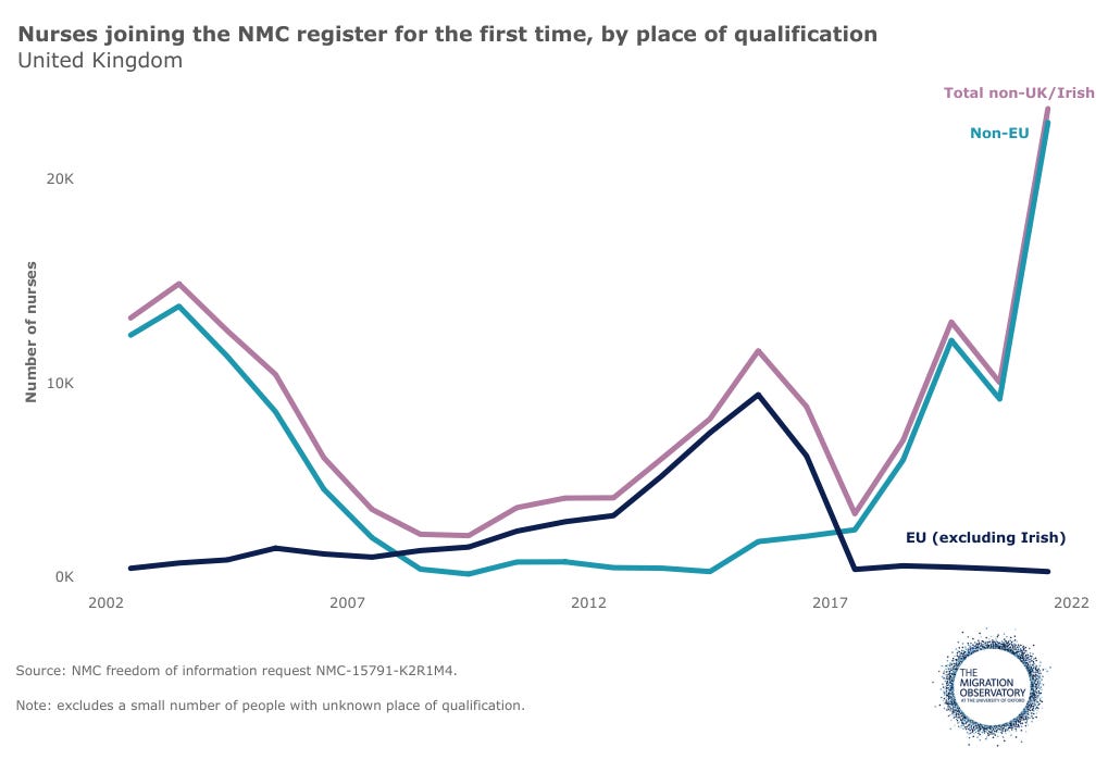 By 2021 we reached the point where not only had new registrations of EU nurses had collapsed, but we were also looking at a mass exodus of this group, with a net decrease from 38,992 EU nurses to 30,311.