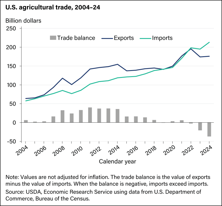 The combination of status quo free trade policies with the weakening of domestic economic policies like supply management and price supports has had dramatic adverse impacts on the American agricultural sector. Small-scale farmers both domestic and international have been undercut for decades in service to a false solution centering expansion of export markets in lieu of regulating domestic markets to deliver fair prices. In 2019, for the first time in more than fifty years, the US imported more dollars worth of agricultural products than we exported. Now, our agricultural trade deficit is at its highest ever, reaching more than $72 billion in 2024. That means that while the US relies on trade with other countries to ensure the supply of food, the Administration is using tariffs to actively attack those countries. Broad, poorly planned tariffs have the potential to further destabilize our domestic markets in an already tumultuous year for farmers.