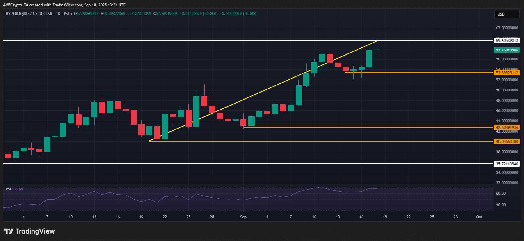 Hyperliquid [HYPE] is flying to fresh all-time highs thanks to a perfect storm of catalysts. On 17 September, HYPE ripped by 6.15%, taking out the old $57-ceiling. Despite a minor correction at press time, the altcoin is now flirting with the $60-threshold.