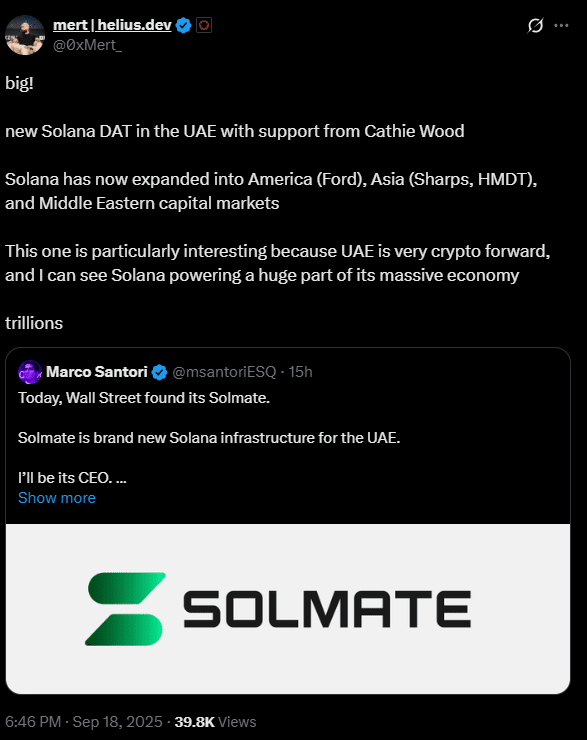 Worth pointing out that SOL treasury recently got two players $500 million for Helius and $1.65 billion for Forward Industries, all backed by Pantera Capital.