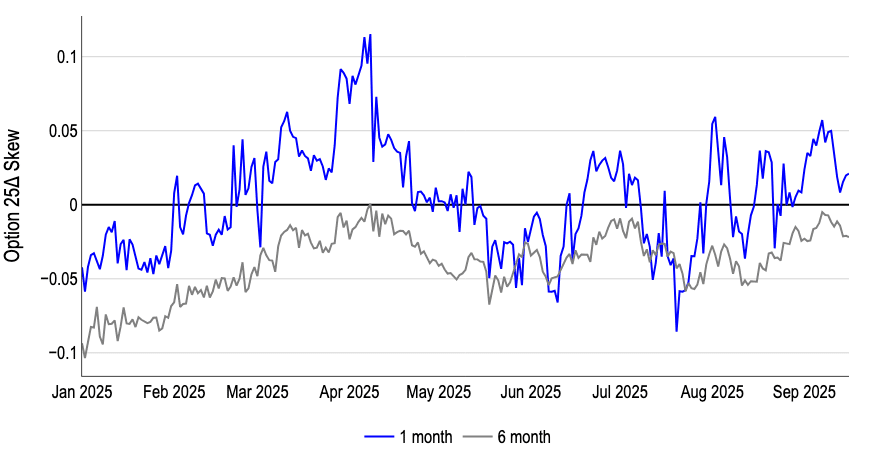 “The six-month skew is closer to flat (and falling), indicating near-term event hedging alongside a more neutral medium-term stance—conditions that we think support a “buy the dip” environment.”