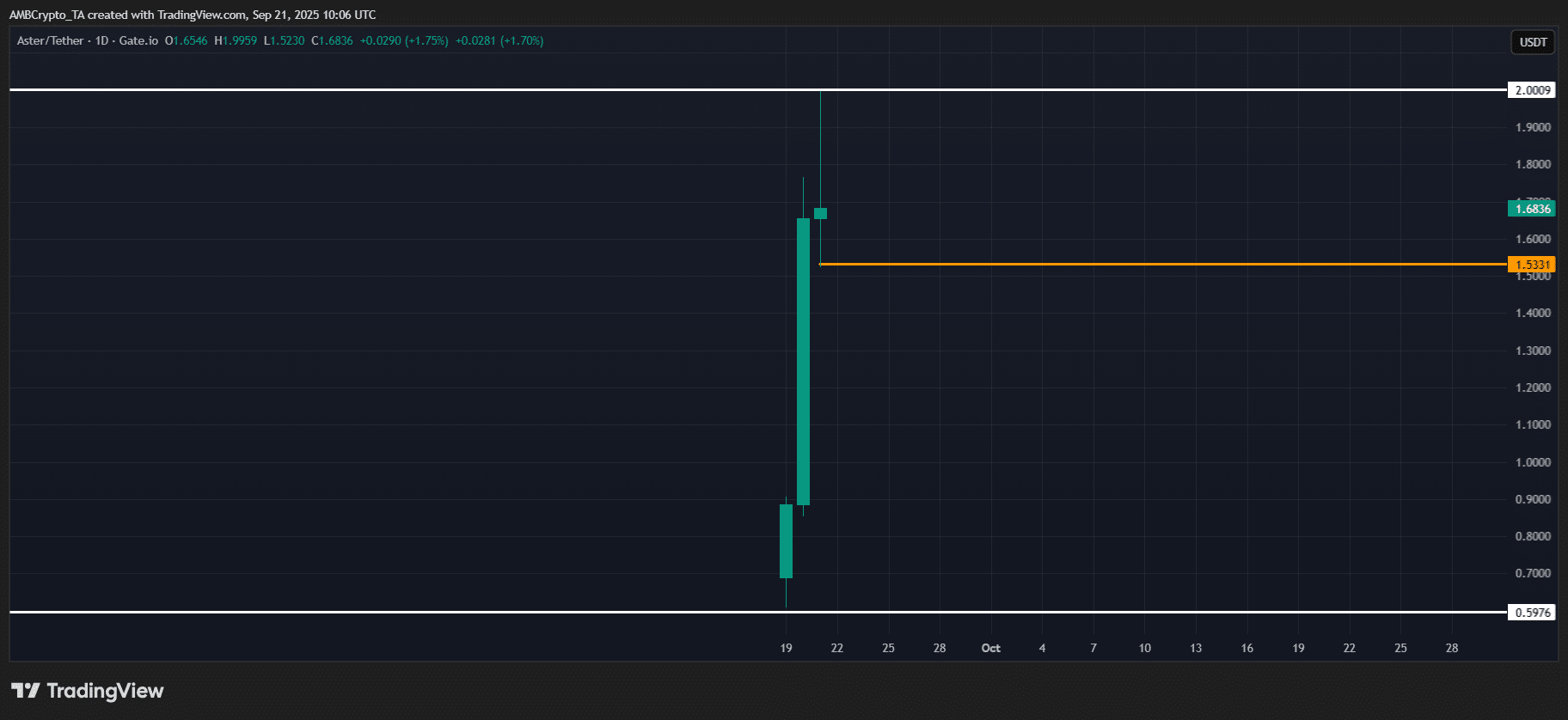 After hitting an intraday $2 all-time high, ASTER pulled back 20%, with early HODLers taking profits. Still, the price is 10% off the day’s low, showing there’s still buying pressure and bullish structure holding.