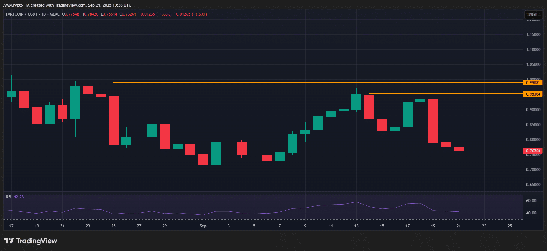 Technically, since its end-July high at $1.69, FARTCOIN has been in a clear downtrend, printing back-to-back red weekly closes despite the broader meme coin market gaining traction.