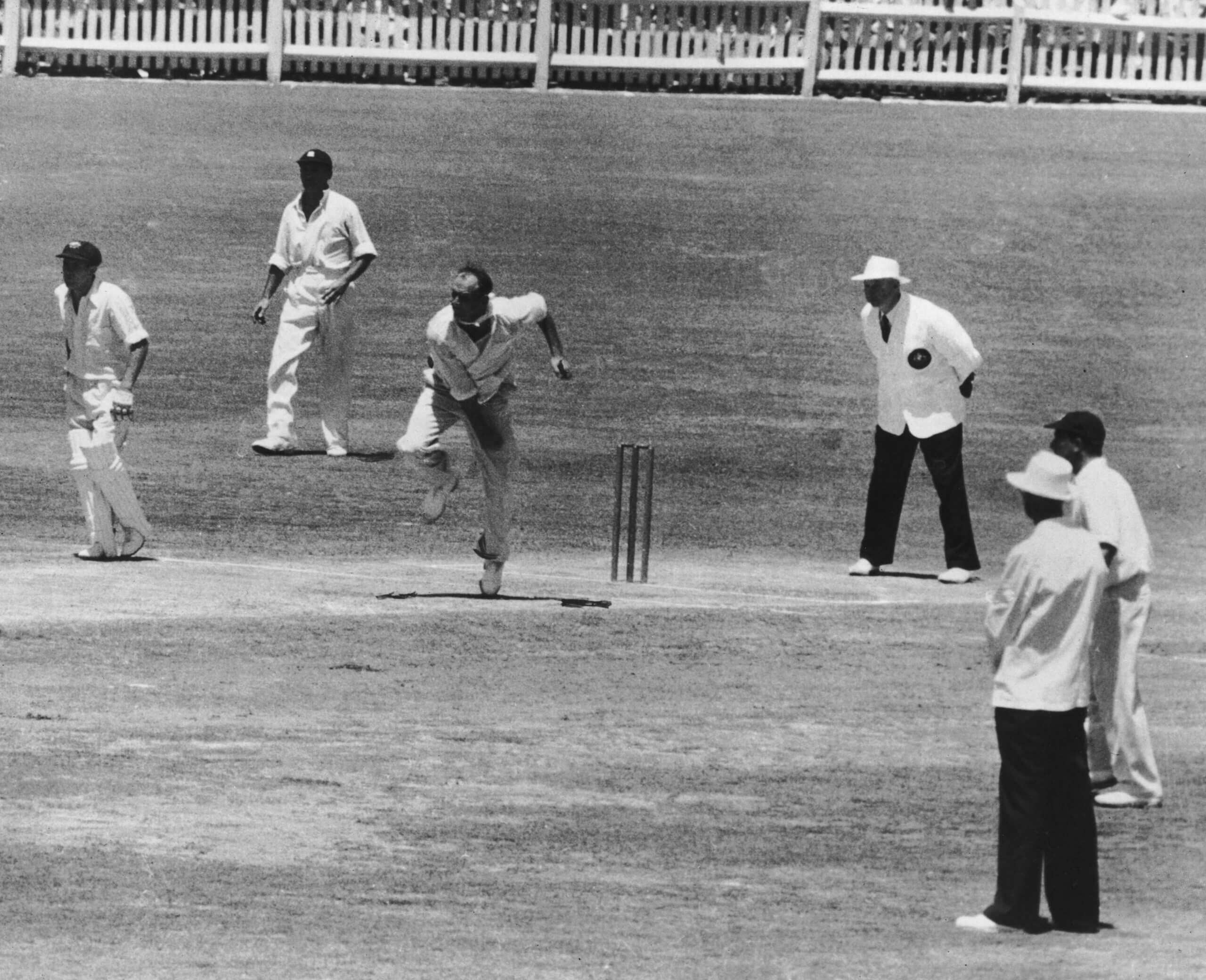 Frank Tyson, the Typhoon, blows through Australia in Adelaide in February 1955 (Central Press/Hulton Archive/Getty Images)