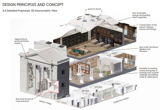 “In order to achieve this vision, the proposals seek to reunite the ground floor of the building (currently leased out as a pub/restaurant and formerly a bank) with the historic library which is still housed on the upper floors of the building.