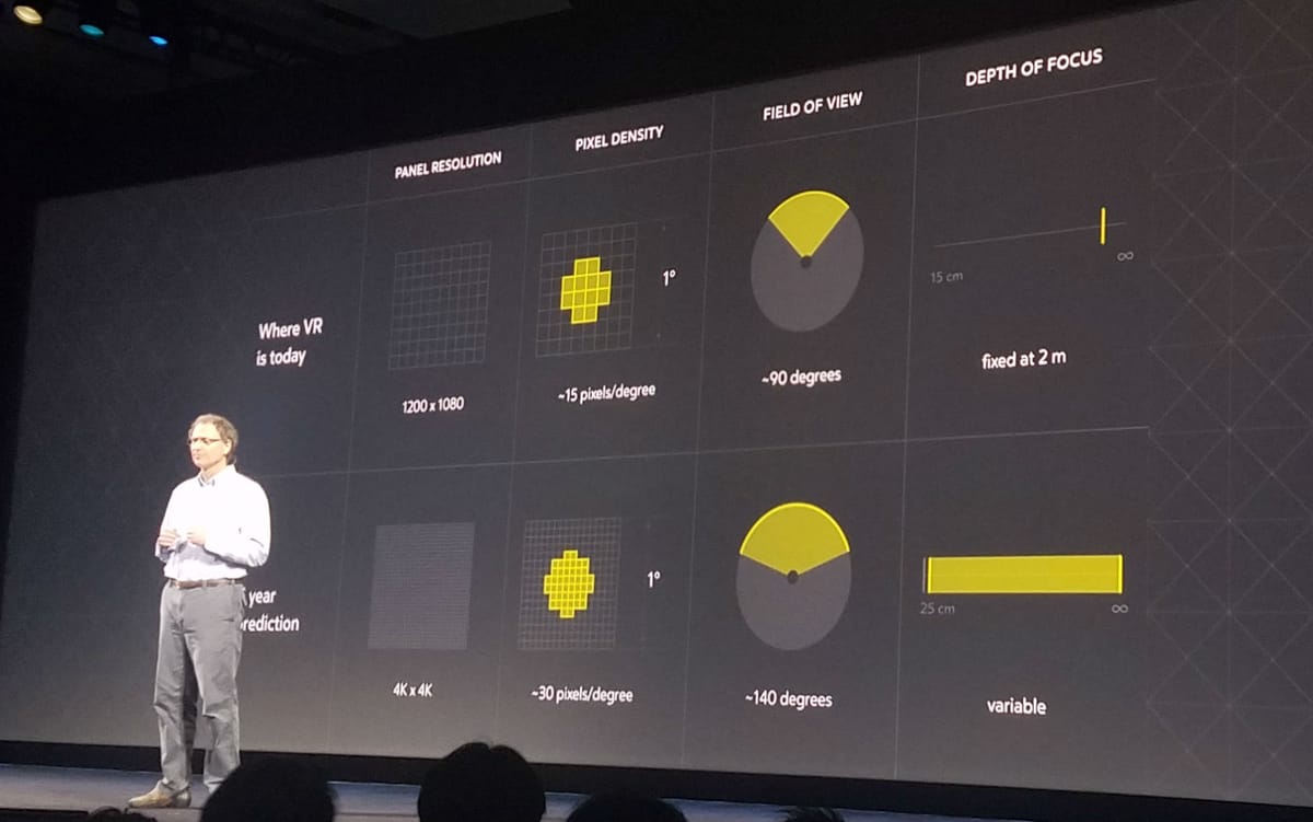 Abrash’s most famous (or perhaps infamous) predictions were made in 2016, at Oculus Connect 3, when he laid out the exact resolution and field of view he believed VR would reach by 2021, and said that he thought this would come with variable focus.