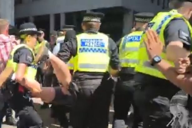 Police carry a protester away at a Palestine protest in St Peter’s Square, Manchester, on July 12(Image: Defend Our Juries)