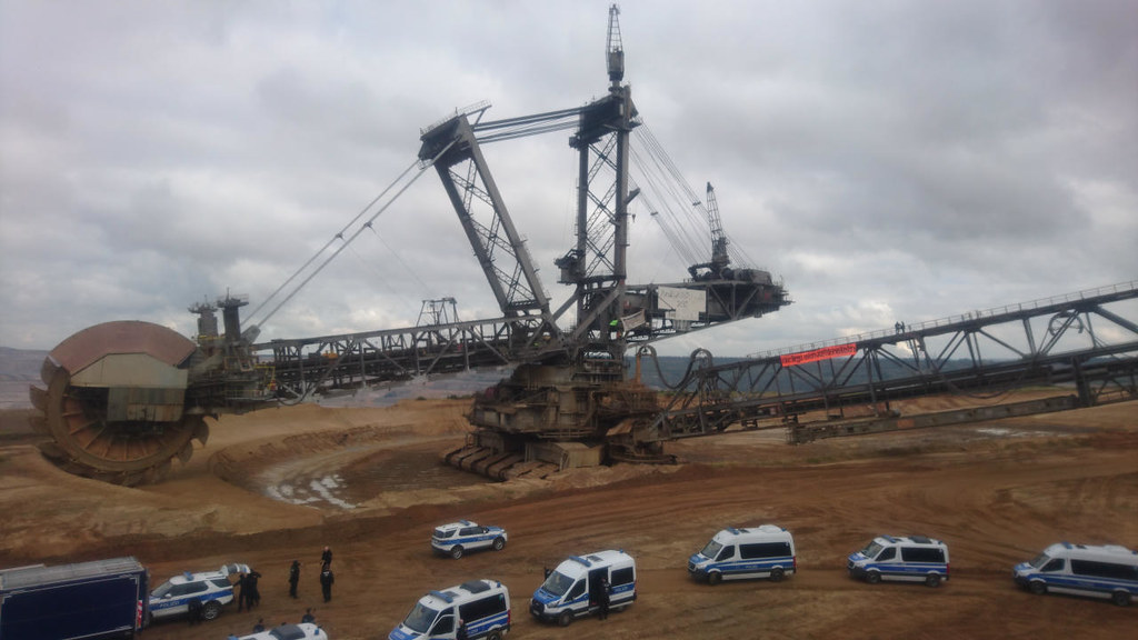 Several “pirates” occupied a coal excavator in the Hambach open-cast mine in Germany early this morning (26 September), bringing part of the mine’s assembly lines to a standstill. The activists carried various pirate accessories and hoisted banners reading “Board the coal excavator, capsize capitalism” and “Shut Down Capitalism. Save the planet. Install Anarchism”.