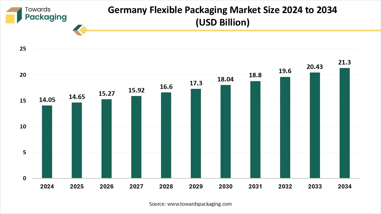 Ottawa, Sept. 26, 2025 (GLOBE NEWSWIRE) — The global Germany flexible packaging market generated revenue of USD 14.65 billion in 2025, and this figure is projected to grow to USD 21.3 billion in 2034, according to research conducted by Towards Packaging, a sister firm of Precedence Research.