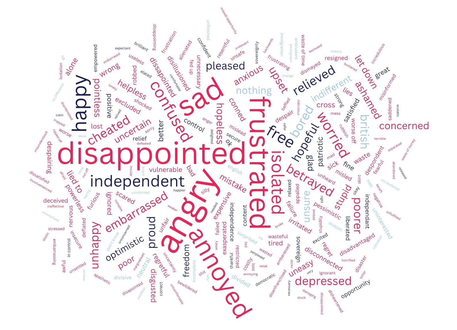 People were also asked to give three words to describe how they felt about Brexit, and the results painted a bleak picture. The most common expressions were those of “anger” and “frustration” (28%), followed by “sadness” (16%), and “disappointment” or “let down” (15%). Feelings of betrayal and being lied to followed closely at 10%.