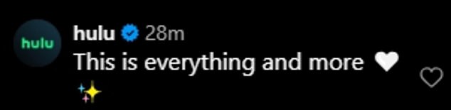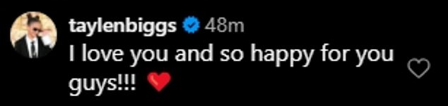 Media personality Taylen Biggs commented, ‘I love you and so happy for you guys!!!’ and Hulu’s Instagram page added, ‘This is everything and more,’ followed by a white heart emoji.