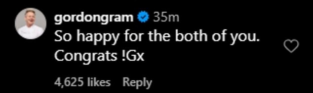 Gordon Ramsey wrote, ‘So happy for the both of you. Congrats! Gx,’ and Blanco sweetly shared, ‘my wife in real life.’
