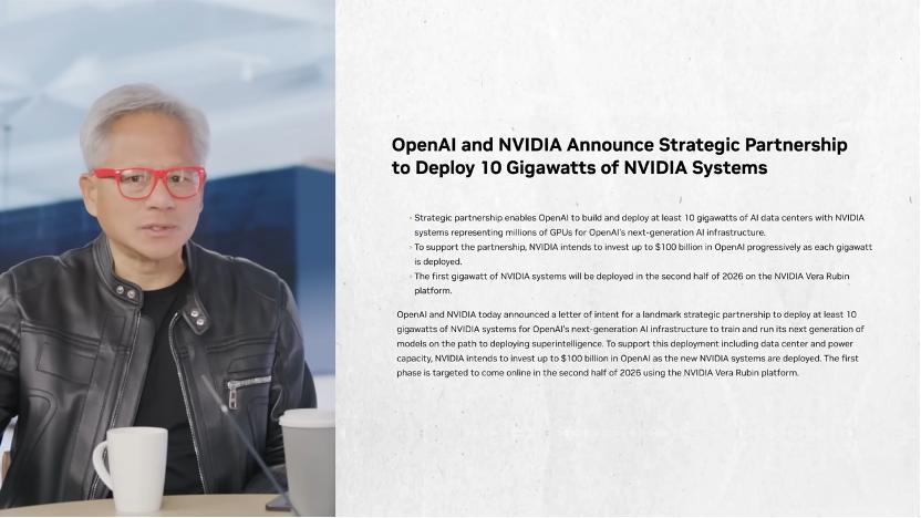 Host: This really brings us to the groundbreaking moment that everyone has been talking about this week. A few days ago, you announced that huge deal with OpenAI’s Stargate project. You’ll become the preferred partner and invest $100 billion in the company. For a period of time, they’ll build at least a 10 – gigawatt AI data center, and if they use NVIDIA for the data center construction, it could mean up to $400 billion in revenue for NVIDIA. So please help us understand. Tell us something about that partnership. What does it mean to you, and why is this investment so meaningful for NVIDIA?