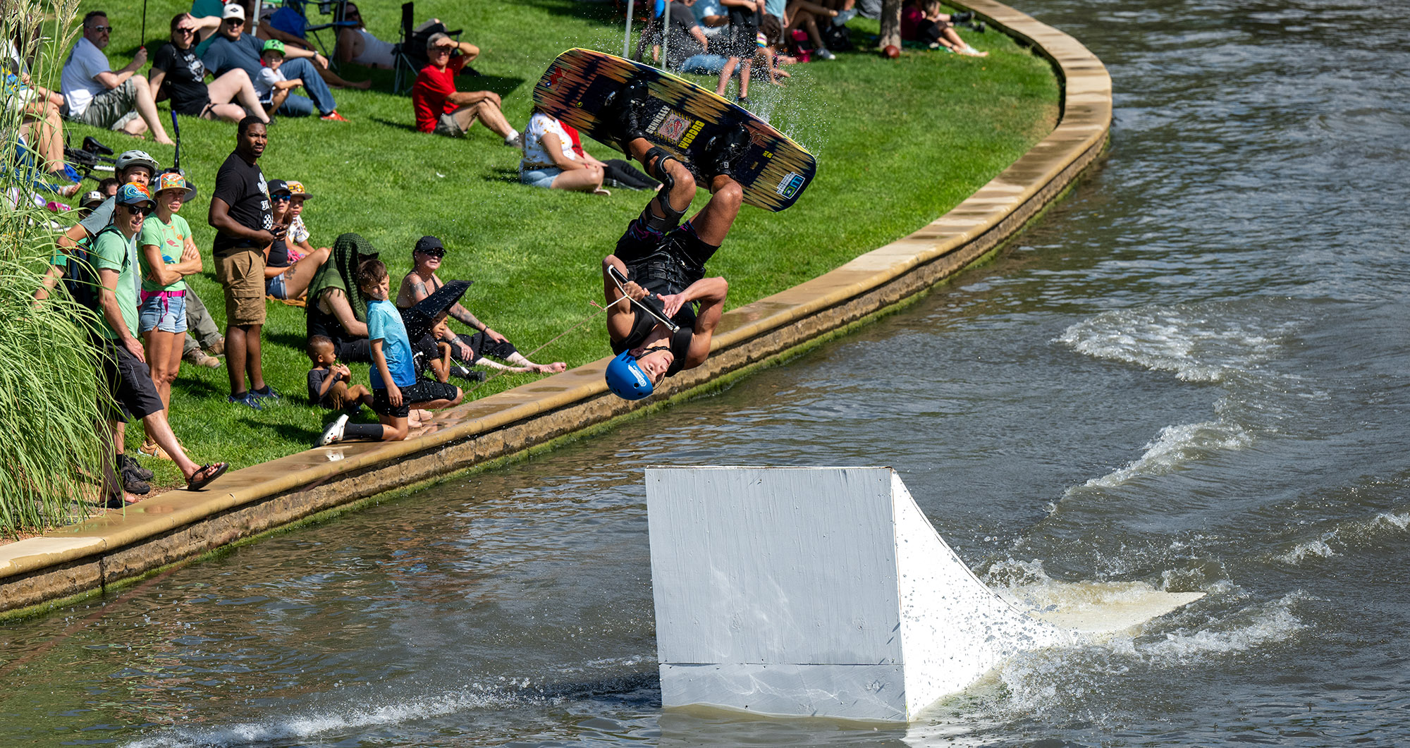 A wakeboarder does a 360-degree flip while being pulled by a cable in the Riverwalk channel during Riverfest 2025 last month in Pueblo. (Mike Sweeney, Special to The Colorado Sun)