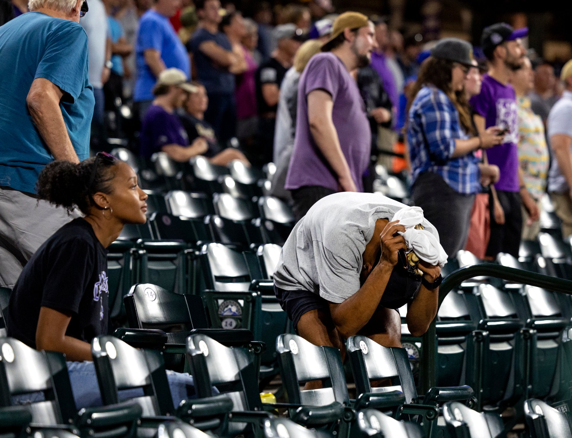 Colorado Rockies fans react late in the game against Arizona, August 15, 2023, at the Coors Field in Denver. (Hugh Carey, The Colorado Sun)