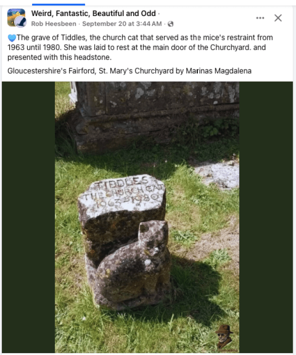 Tiddles the tabby cat became a well-known figure at St Mary the Virgin Church in Fairford, Gloucestershire. From 1963 until her death in 1980, she was a familiar sight and helped keep the church mice at bay.