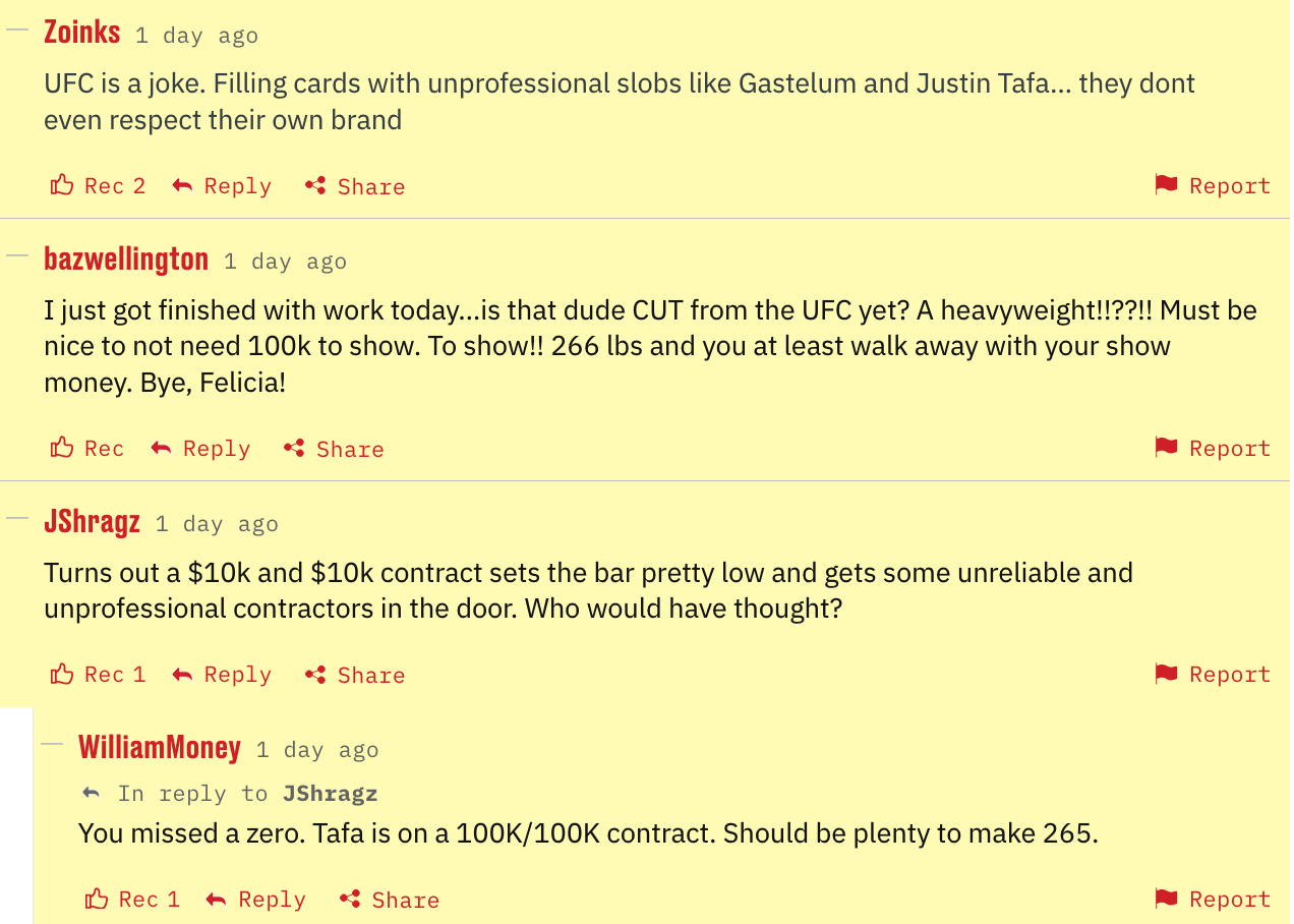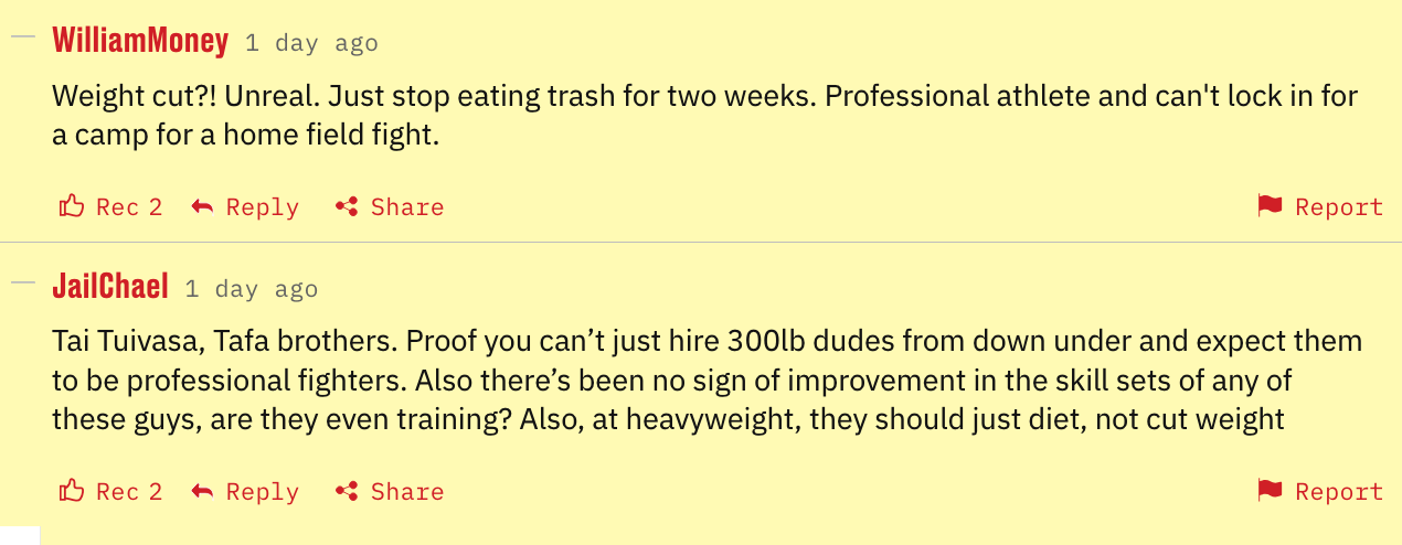 Last week, our readers torched Kelvin Gastelum for missing the weight for the 500th time this last week, and legendary coach, Ray Longo, blamed the UFC — well, Heavyweight Justin Tafa was going to miss weight for the second time but ended up pulling out with health-related issues … well, he got the Gastelum treatment too.