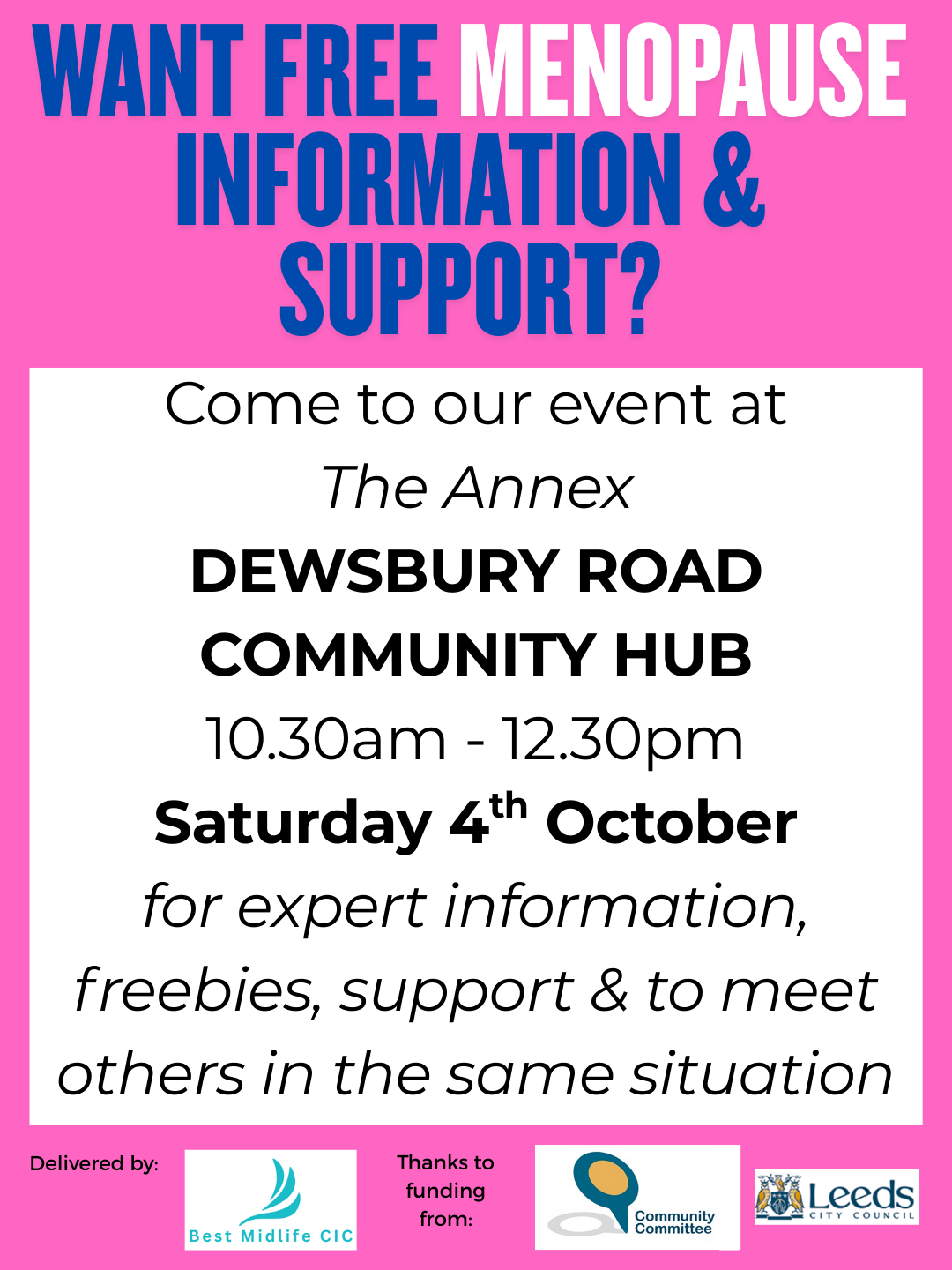 Saturday (4 October 2025) will see a menopause support event held at Dewsbury Road Community Hub.